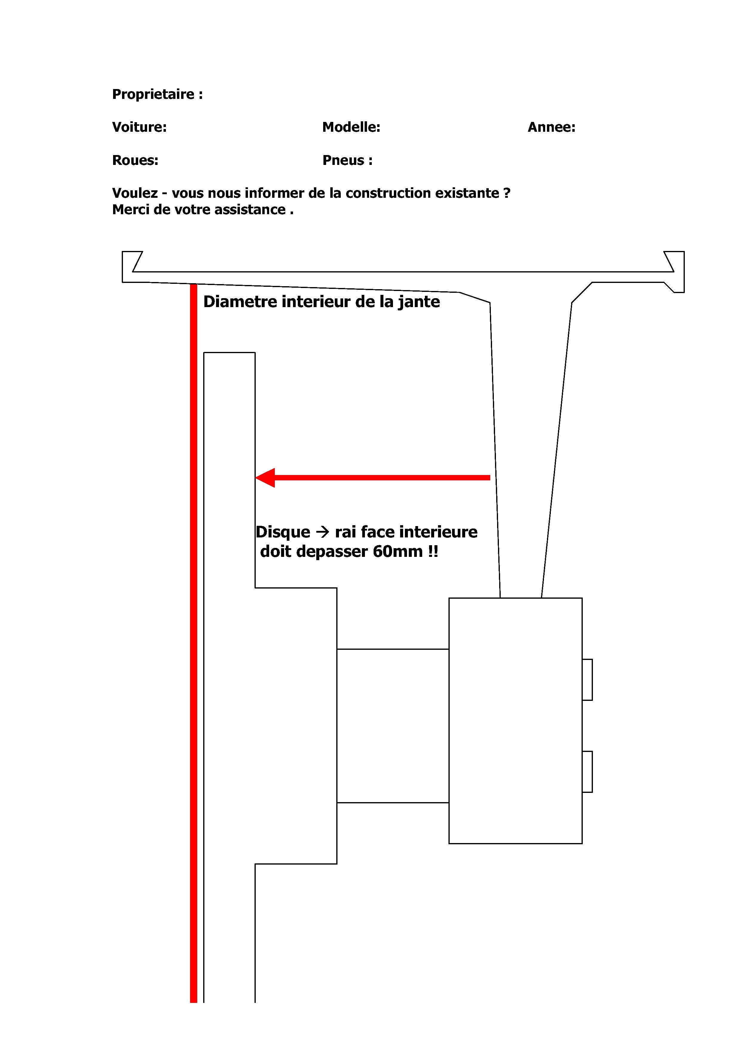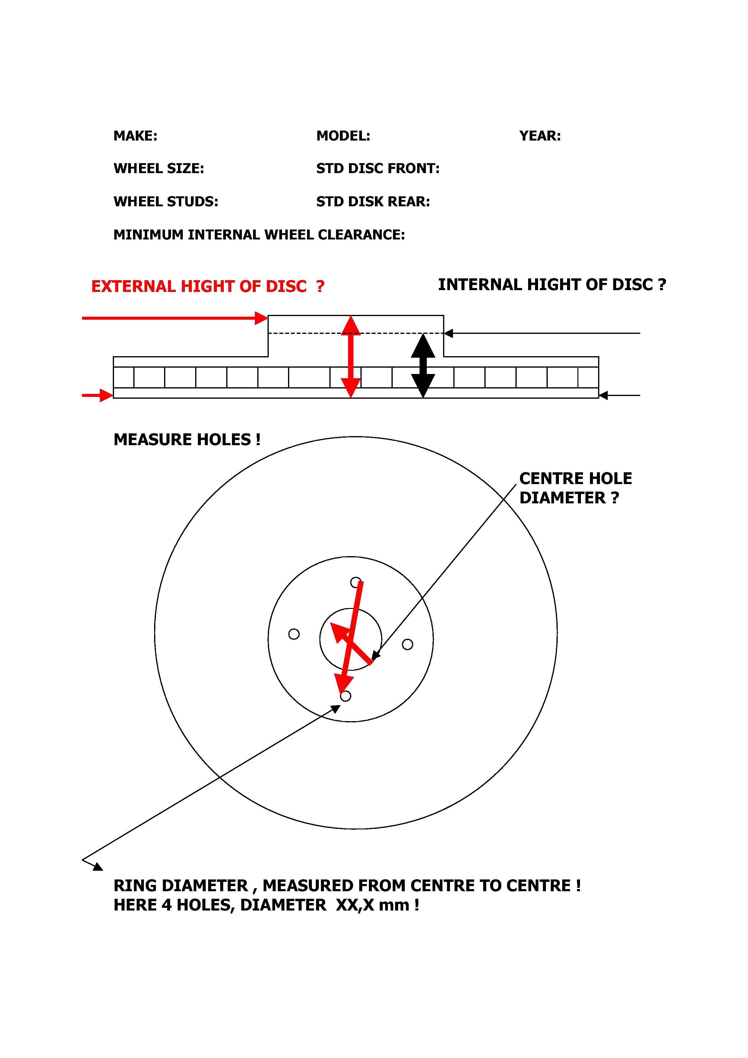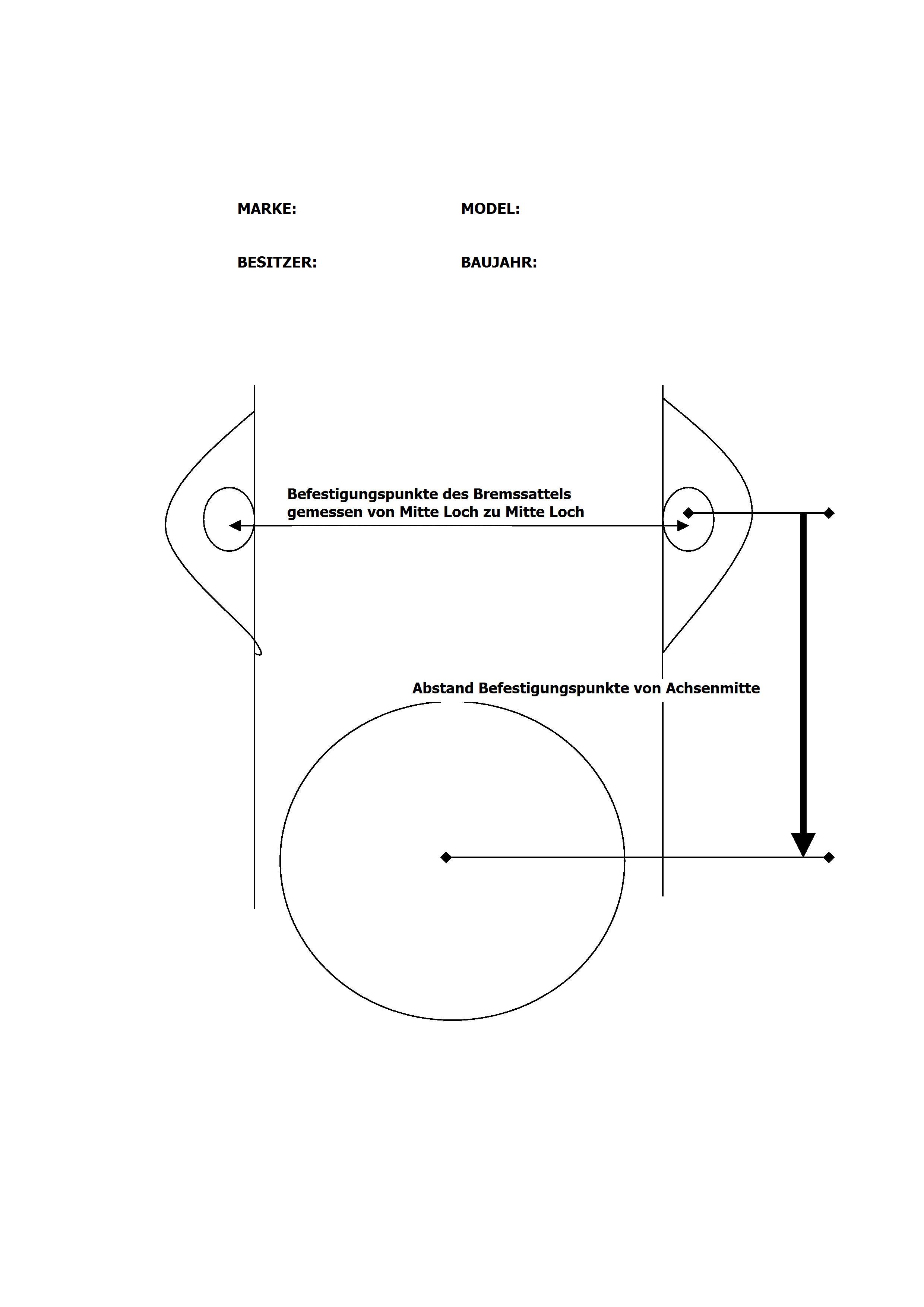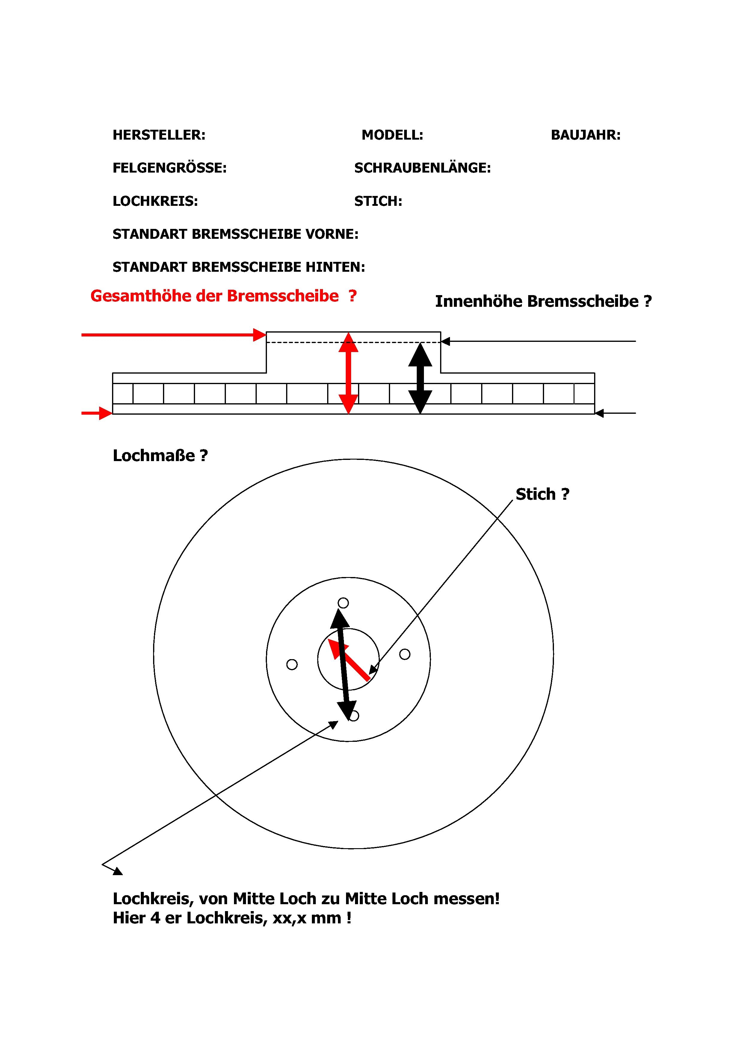 Für ein passendes Endprodukt benötigen wir Ihre Unterstützung ! Jede Einbausituation ist unterschiedlich durch Felgenart, Formgebung und Dimension, Radträger etc. müssen überprüft und vermessen werden, damit die Bremsanlage passend gefertigt werden kann . Ihre exakten Messungen liefert uns dazu die Grundlage . Deutsches Formular: Bitte ausdrucken, nachmessen und einfüllen ! FAX Rücksendung an 0049 721 151 348 630